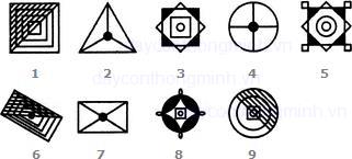 1, 6, 9 là các hình được tô một nửa bởi các đường chéo. 2, 4, 7 đều được chia thành các phần bằng nhau (ba hoặc bốn phần) bằng các đường thẳng và cũng có một vòng tròn màu đen ở tâm. 3, 5, 8 có thiết kế tương tự và có bốn góc được tô đen.
